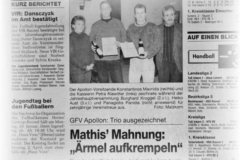 In ihrer Serie "Yesterday" berichteten die Ruhr Nachrichten am 22. Januar 2016 in ihrem Lokalsportteil recht ausführlich über die Entstehungsgeschichte und die Auflösung des Castrop-Rauxeler Fußballvereins GFV Apollon aus Ickern.