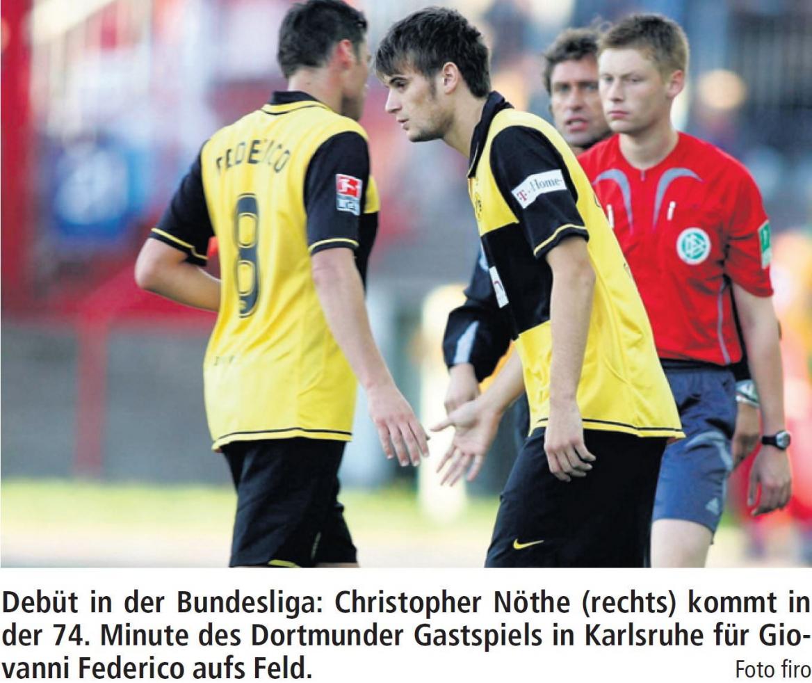 Nöthe kam für den Dortmunder Mittelfeldspieler Giovanni Federico, offenbar um dem BVB beim Stande von 1:2 frischem Drang auf das KSC-Tor zu verleihen. Was Nöthe in den verbleibenden 16 Minuten nicht mehr gelang, am Ende seines ersten Bundesliga-Spiels steht nun eine bittere 1:3-Niederlage zu Buche. Nöthe war zuletzt verstärkt in der Dortmunder Regionalliga-Equipe als Torjäger aufgefallen.