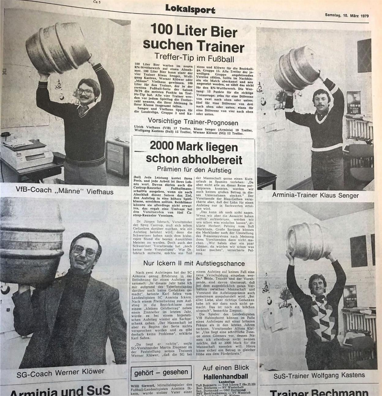 Im Jahr 1979 waren auch die Journalisten recht kreativ. Sie stellten eine Trainer-Wette auf die Beine. Die Coaches der vier hochklassig spielenden Clubs tippten die Ergebnisse in ihren Ligen. Neben Viefhaus (VfB) und Senger wirkten hier auch die Bezirksliga-Trainer Werner Klöwer (SG Castrop) und Wolfgang Kastens (SuS Merklinde) mit. Als Gewinn winkte dem besten Tipper am Ende der Saison ein volles 100-Liter-Fass Bier. Bei einem Fototermin reckten alle Übungsleiter das Fass in die Höhe, das hier noch leer war. Viefhaus meinte im Rückblick: „Ich kann nicht genau sagen, wer damals den Wettbewerb gewonnen hat. Ich bin allerdings kein eingefleischter Bier-Trinker.“ Daher habe ihn der Preis selbst beim Tippen nicht motiviert.