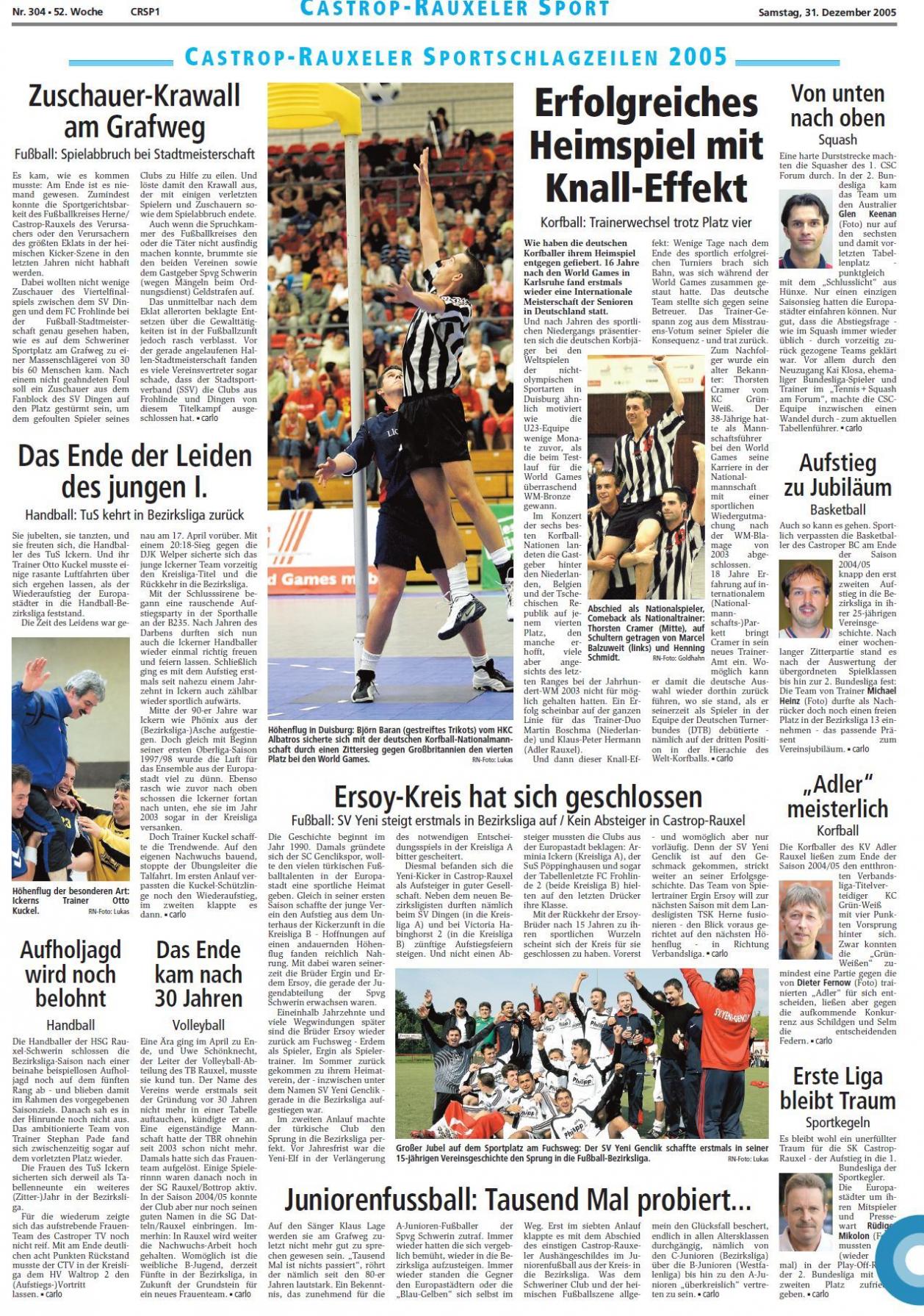 Die Korfballer des KV Adler Rauxel ließen zum Ende der Saison 2004/05 den entthronten Verbandsliga-Titelverteidiger KC Grün-Weiß mit vier Punkten Vorsprung hinter sich. Zwar konnten die „Grün-Weißen“ zumindest eine Partie gegen die von Dieter Fernow (Foto) trainierten „Adler“ für sich entscheiden, ließen aber gegen die aufkommende Konkurrenz aus Schildgen und Selm die entscheidenden Federn. carlo
